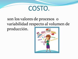 Este documento describe los diferentes tipos de costos asociados con la producción de una empresa. Explica que los costos fijos no varían con la producción, mientras que los costos variables sí lo hacen. El costo total es la suma de los costos fijos y variables. El costo marginal es el incremento en el costo total por cada unidad adicional producida. Proporciona una tabla como ejemplo para ilustrar estos conceptos.