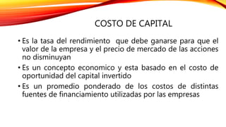El costo de capital es la tasa de rendimiento necesaria para mantener el valor de la empresa y el precio de las acciones, y se calcula como un promedio ponderado de los costos de las distintas fuentes de financiamiento como préstamos bancarios, bonos, acciones y utilidades retenidas. El costo de capital considera la tasa real de retorno esperada por los inversionistas, la inflación esperada y el riesgo asociado a la inversión.