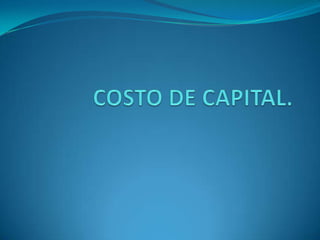El documento explica diferentes métodos para calcular el costo de la deuda, el costo de las acciones preferentes y comunes, y el costo de capital promedio ponderado (WACC) de una empresa. Describe fórmulas como el CAPM y cómo calcular la tasa interna de retorno para determinar estas tasas de rendimiento requeridas. También cubre cómo calcular estas métricas cuando una empresa no cotiza en bolsa.