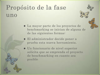 La primera fase del proceso de benchmarking incluye establecer el plan de estudio mediante la selección de un tema, determinar la mejor métrica, documentar el proceso, redactar una declaración de propósitos y seleccionar socios comparables. El objetivo es definir claramente qué y cómo se va a medir a través del benchmarking para identificar áreas de mejora.