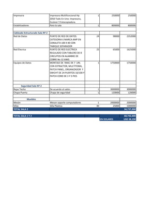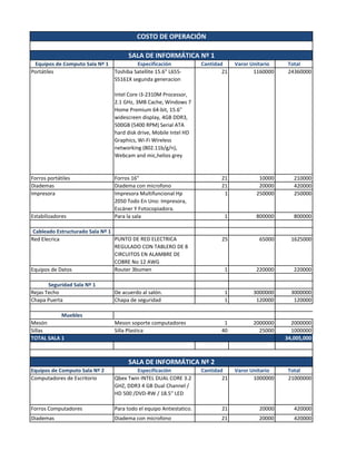 El documento resume los costos de operación de dos salas de informática. Detalla los equipos de computo, accesorios, cableado estructurado, seguridad e instalaciones eléctricas para cada sala. El costo total de la Sala 1 es de $34,005,000 pesos y de la Sala 2 es de $34,737,000 pesos. El costo total de ambas salas es de $68,742,000 pesos o $38,190 dólares.