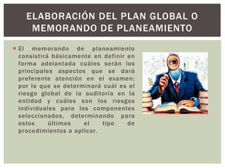 Este memorando de planeamiento describe el objetivo y alcance de la auditoría financiera de la empresa Maxima Internacional S.A. para el año 2014. El objetivo es determinar si los estados financieros presentan razonablemente la situación financiera, resultados y flujos de efectivo de acuerdo a los principios contables generalmente aceptados. El alcance comprende el periodo de enero a diciembre de 2014 y seguirá las normas de auditoría aceptadas. Se describen también aspectos del ambiente de control de la empresa como la organización, sistemas contables y