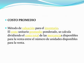 El documento describe el método del costo promedio ponderado para valuar inventario. Este método calcula el costo promedio por unidad dividiendo el costo total de las mercancías disponibles entre el número total de unidades. Luego usa este costo promedio para valuar el inventario final y calcular el costo de las mercancías vendidas. También explica cómo calcular el costo unitario total, fijo y variable para diferentes niveles de producción.