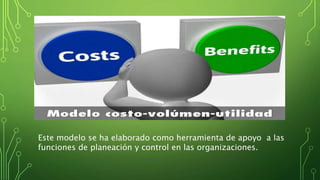 Este documento presenta el análisis de costo-volumen-utilidad, el cual es una herramienta para la planeación y control en las organizaciones. Explica que los costos, volumen de producción, precio de venta y utilidad están relacionados, y cómo determinar el punto de equilibrio financiero, volumen de ventas requerido para alcanzar una utilidad deseada, y margen de seguridad de una empresa. También identifica supuestos y limitaciones del modelo.