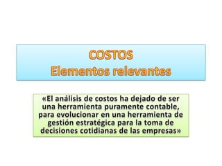 El documento describe la importancia de la gestión de costos para la planeación y toma de decisiones de emprendedores. Explica que los costos son el sacrificio económico para producir un bien o servicio, diferenciándolos de gastos y pérdidas. Además, clasifica los costos según si son pasados, presentes o futuros, y según sus componentes, comportamiento e identificación con la actividad.