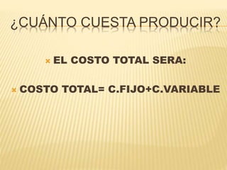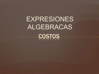 Este documento presenta información sobre expresiones algebraicas y costos en la producción. Explica que el costo total es la suma del costo fijo y el costo variable. También presenta una función de costo total y ejemplos de costos fijos y variables en una fábrica. Finalmente, proporciona datos sobre el profesor, curso, tema y bibliografía relacionados con el documento.