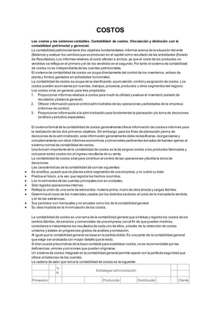 El documento describe los objetivos y características de la contabilidad de costos. La contabilidad de costos clasifica, acumula, controla y asigna costos para tres propósitos: proporcionar informes de costos, ofrecer información para el control administrativo, y proporcionar información para la planeación y toma de decisiones. La contabilidad de costos es analítica, predice el futuro y el costo, y determina el costo de materiales, mercadería vendida y existencias para contribuir al control de operaciones y facilitar la toma de