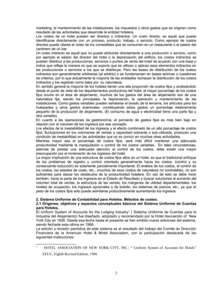 Este documento discute los sistemas de contabilidad y costos para empresas hoteleras. Explica que el Sistema Uniforme de Contabilidad para Hoteles establece estándares para la industria y facilita la comparación entre hoteles. También describe las características únicas de los costos y operaciones de los hoteles, incluyendo altos costos fijos, fluctuaciones estacionales en los ingresos, y la naturaleza perecedera de los servicios hoteleros.