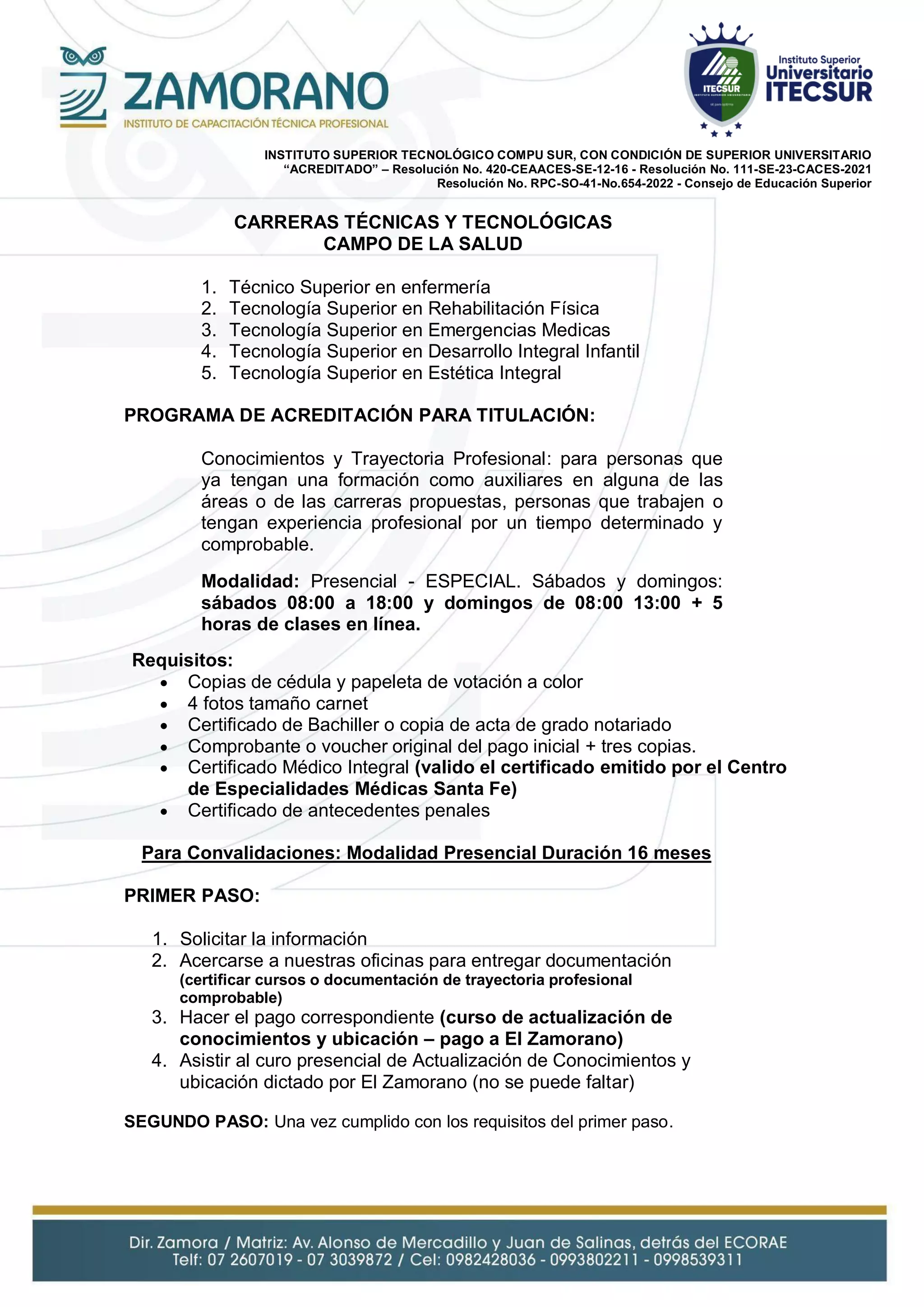 El Instituto Tecnológico Superior Compu Sur ofrece programas técnicos y tecnológicos en el campo de la salud como Técnico Superior en Enfermería, Tecnología Superior en Rehabilitación Física y Emergencias Médicas. El instituto también ofrece programas de acreditación para titulación y formación completa desde primer semestre para personas con y sin experiencia previa en áreas de la salud. Cuenta con filiales autorizadas a través de convenio en Zamora, Loja, Yantzaza, Zaruma y Macas.