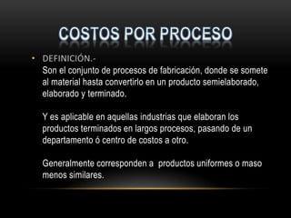 El documento describe el sistema de costos por procesos, el cual asigna los costos a los productos a medida que pasan por cada etapa de producción. Este sistema se usa cuando la producción es continua y los productos pasan de manera secuencial a través de múltiples centros de costos. El costo unitario de cada producto se calcula dividiendo el costo acumulado total de cada centro de costos entre las unidades equivalentes producidas.