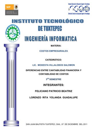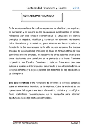 Este documento compara la contabilidad financiera y la contabilidad de costos. Explica que la contabilidad financiera registra, clasifica y resume las operaciones monetarias de una empresa para informar a terceros, mientras que la contabilidad de costos determina, registra y analiza los costos de producción, distribución, administración y financiamiento para la toma de decisiones interna. La principal diferencia es que la contabilidad financiera informa a externos, mientras que la contabilidad de costos apoya la planificación y control internos.