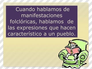 Este documento describe varias manifestaciones folclóricas de Chile, incluyendo festividades religiosas como la Fiesta de la Virgen de Andacollo y la Fiesta de Cuasimodo, fiestas patrias como el 18 y 19 de septiembre, tradiciones como la minga chilota, comidas típicas de diferentes regiones, juegos populares como el trompo, el tejo y el luche, y artesanías con materiales como la lapislázuli, la lana, la madera y la cerámica.