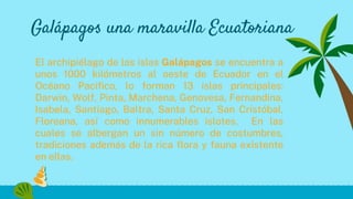 El archipiélago de Galápagos, ubicado a 1000 kilómetros de Ecuador, consiste en 13 islas principales y es conocido por su rica flora, fauna y costumbres. Se celebran fiestas de provincialización en Santa Cruz y San Cristóbal cada 18 de febrero, así como festividades patronales y de Santa Águeda en agosto y febrero, respectivamente. La gastronomía local incluye platos como el arroz marinero y el bolón de verde.