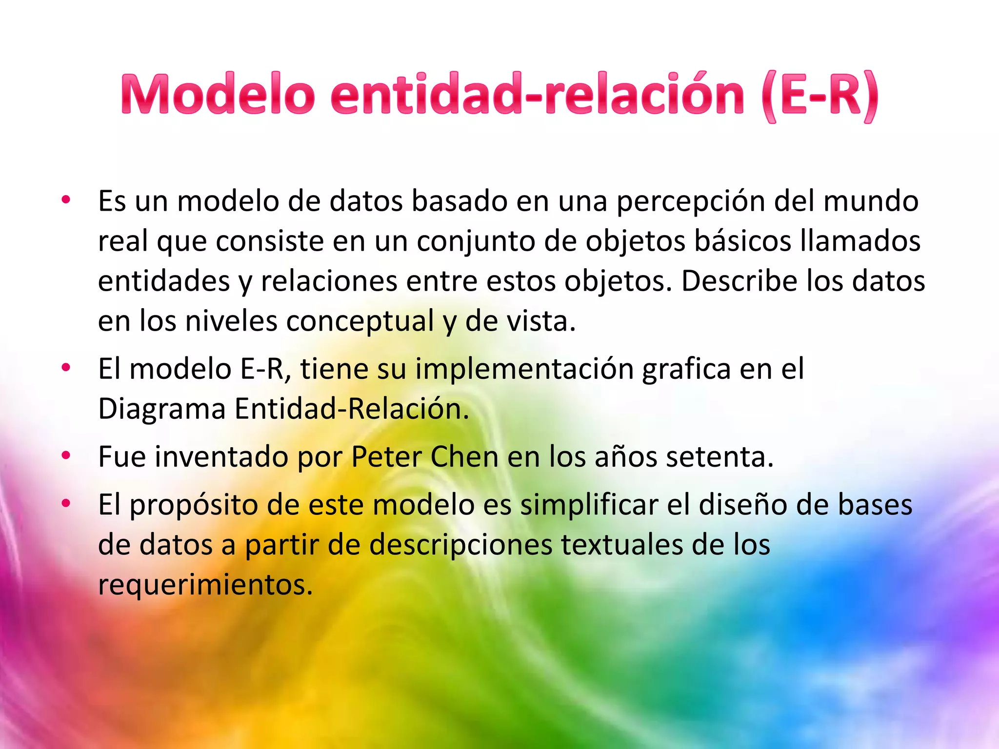 El documento describe el modelo entidad-relación (E-R), un modelo de datos desarrollado por Peter Chen en los años 1970 que representa los datos mediante entidades, relaciones y atributos. El modelo E-R se implementa gráficamente a través de diagramas entidad-relación y sirve para simplificar el diseño de bases de datos a partir de descripciones de requisitos.