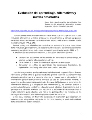 Este documento describe las técnicas de evaluación alternativa, las cuales se enfocan en evaluar el desempeño y procesos de aprendizaje de los estudiantes en lugar de sólo evaluar resultados. Describe varias técnicas como mapas mentales, resolución de problemas, proyectos y portafolios. Explica que estas técnicas permiten evaluar una variedad de habilidades, conocimientos y actitudes de una manera más integral que las evaluaciones tradicionales.