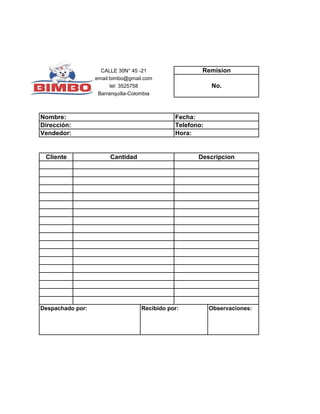 Este documento es una remisión de venta que incluye la información del cliente, como su nombre, dirección, número de teléfono y correo electrónico, así como detalles de la transacción como la fecha, hora, cantidad y descripción de los productos despachados y recibidos, y observaciones adicionales.