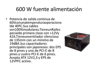 Este documento contiene una cotización para una computadora que incluye una fuente de alimentación de 600W, un procesador Core i7-2600k, una placa madre DP67BG, 8GB de memoria RAM DDR3, una unidad de estado sólido de 80GB, un disco duro de 2TB, una tarjeta de video GeForce GTS 450, un lector/grabador Blu-Ray, un teclado y mouse inalámbricos MK250, y una licencia de Windows 7 Home Premium, por un total de $19,956.786.
