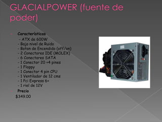 Este documento presenta una cotización de componentes para un sistema de computadora, incluyendo una fuente de poder, cooler, procesador, placa base, memoria RAM, discos duro y SSD, tarjeta de video, unidad óptica, teclado, mouse, gabinete, sistema operativo Windows 7 y el programa CPU-Z para verificar las especificaciones del sistema. Se proporcionan las características y precios de cada componente individual.