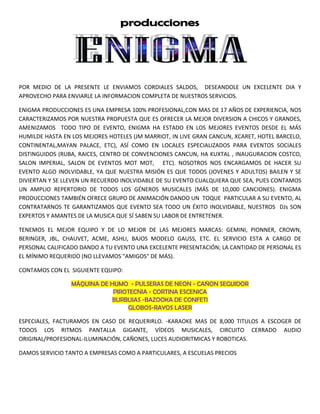 Enigma Producciones es una empresa con más de 17 años de experiencia ofreciendo servicios de entretenimiento para todo tipo de eventos. Cuentan con equipo profesional de audio, iluminación, video y animación. Ofrecen diversos paquetes para eventos pequeños, medianos y grandes, adaptados a diferentes presupuestos e incluyendo todo lo necesario para garantizar el éxito y diversión del evento.