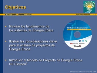 Este documento proporciona una introducción a los sistemas de energía eólica, incluidos sus componentes principales, tipos, y aplicaciones tanto conectadas a la red como sin conexión. Explica los factores clave que deben considerarse en el análisis de proyectos de energía eólica, como los recursos eólicos, costos, y regulaciones. También presenta el modelo RETScreen para evaluar proyectos de energía eólica y valida su precisión al compararlo con simulaciones y datos reales.