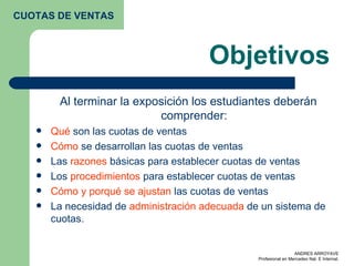 El documento proporciona información sobre cuotas de ventas. Explica que las cuotas de ventas son metas cuantitativas que se establecen para los vendedores con el fin de motivarlos, evaluar su desempeño y controlar sus actividades. También describe los diferentes tipos de cuotas como cuotas de volumen de ventas, cuotas financieras y los pasos para establecer cuotas de ventas de manera efectiva.