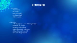Este documento resume las generalidades, diagnóstico y tratamiento de COVID-19. Describe la definición, etiología, epidemiología y fisiopatología de la enfermedad. Explica los métodos de diagnóstico como las pruebas y la imagenología, así como los criterios diagnósticos. También cubre la presentación de la enfermedad en pacientes pediátricos y las opciones de tratamiento disponibles según las directrices médicas.