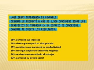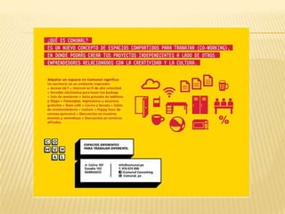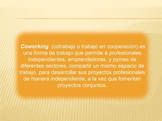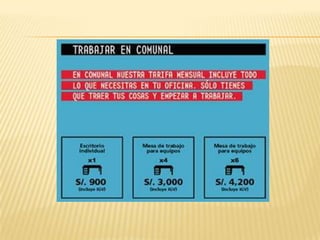 El documento presenta información sobre el coworking (trabajo compartido), incluyendo una lista de integrantes, la definición de coworking, un resumen de cómo surgió esta cultura y detalles sobre la empresa Comunal Coworking en Perú. Comunal Coworking ofrece espacios de trabajo compartido para profesionales independientes, emprendedores y pymes, con diferentes planes de tarifas que incluyen acceso a las instalaciones, servicios y equipamiento.