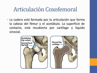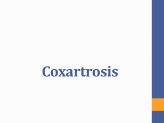 Este documento describe la coxartrosis o artrosis de cadera, incluyendo su anatomía, epidemiología, factores de riesgo, síntomas, diagnóstico y tratamientos. La coxartrosis es una enfermedad reumática común en personas mayores de 50 años que causa dolor e inflamación en la articulación de la cadera. Los tratamientos incluyen fármacos, infiltraciones, fisioterapia, cirugía como artroplastia de cadera, y medidas para aliviar el dolor y mejorar la movilidad