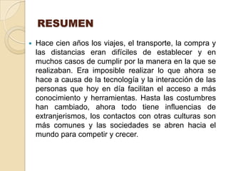 El documento describe algunas características clave de la globalización como los avances científicos, el desarrollo de las comunicaciones, la desregulación de mercados y la mundialización de la política y la economía. También discute los desafíos de la globalización como las desigualdades sociales y la pérdida de identidad nacional. Finalmente, propone tres alternativas para enfrentar estos desafíos: la Tercera Vía, privilegiar el bien común sobre el particular y globalizar la justicia.
