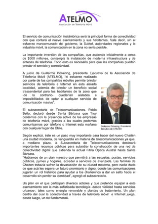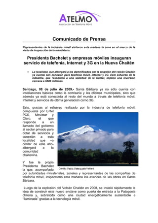 La Presidenta Bachelet y representantes de empresas de telefonía móvil inauguraron servicios de telefonía, Internet y 3G en la nueva ciudad de Santa Bárbara, que albergará a personas desplazadas por la erupción del volcán Chaitén. Las compañías de telefonía invirtieron alrededor de $500 millones para instalar la infraestructura necesaria. El nuevo asentamiento contará principalmente con comunicación inalámbrica para conectar a sus habitantes.