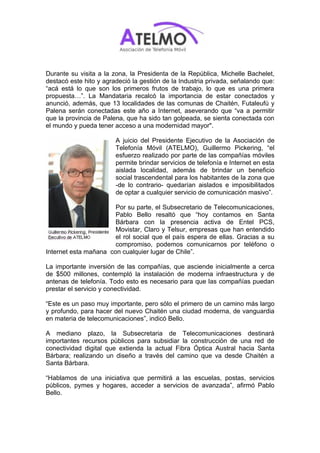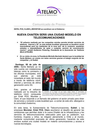 Las compañías Entel PCS, Claro y Movistar, junto con el gobierno chileno, instalaron infraestructura para proveer servicios de telefonía móvil, Internet y 3G a la ciudad de Santa Bárbara, que albergará a residentes desplazados por una erupción volcánica. La Presidenta Bachelet elogió esta iniciativa que conectará a la provincia aislada con el mundo y promoverá su desarrollo.