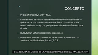 El documento proporciona una guía técnica sobre el manejo de la presión positiva continua (CPAP) en neonatos. Explica que el CPAP mantiene una presión positiva durante la espiración para tratar desórdenes respiratorios como el síndrome de dificultad respiratoria. Describe cómo funciona el CPAP, sus indicaciones, contraindicaciones y los cuidados requeridos para los pacientes. También cubre los diferentes tipos de sistemas CPAP y las intervenciones de enfermería necesarias para administrarlo de manera seg
