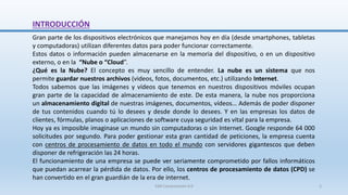 El documento describe los centros de procesamiento de datos (CPD) o data centers como instalaciones esenciales para el almacenamiento y procesamiento de información digital en empresas y organizaciones, destacando su importancia en la era de internet. Se mencionan las características, tipos y componentes de un CPD, así como los estándares de seguridad y la infraestructura necesaria para su funcionamiento adecuado. Finalmente, se enfatiza la necesidad de un ambiente controlado que garantice la seguridad, disponibilidad y rendimiento continuo de los datos.
