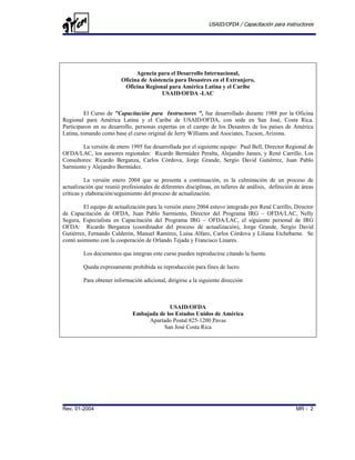 Este documento presenta el material de referencia para un curso de capacitación para instructores desarrollado por USAID/OFDA. Explica que el curso fue creado originalmente en 1988 y ha sido actualizado en varias ocasiones, más recientemente en enero de 2004. El contenido del curso incluye introducción a la capacitación, objetivos, habilidades de comunicación, métodos de enseñanza, evaluación, ambientes de aprendizaje y planeación de lecciones. El propósito del curso es mejorar las habilidades de los participantes como instructores.