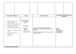 Este documento presenta el plan de estudios para la asignatura de matemáticas en el noveno grado de una escuela ecuatoriana. El plan describe tres unidades de aprendizaje sobre sumas de números racionales, números racionales, y cuerpos geométricos y figuras planas. Para cada unidad, se especifican los objetivos, destrezas, indicadores de evaluación, estrategias, y adaptaciones curriculares. El plan busca desarrollar habilidades matemáticas aplicables a situaciones de la vida real a través de un enfoque prá