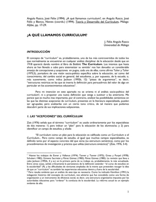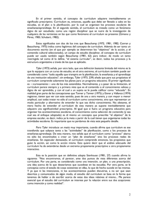 Este documento analiza las diferentes acepciones del término "currículum" que se encuentran en la literatura especializada. Identifica tres acepciones principales: 1) currículum como contenido o conocimiento, 2) currículum como planificación o programa de estudios, y 3) currículum como realidad interactiva que incluye tanto la planificación como los procesos reales de enseñanza y aprendizaje. El documento explora cada una de estas acepciones y sus implicaciones para el estudio y desarrollo del currículum.