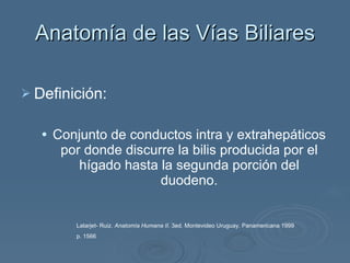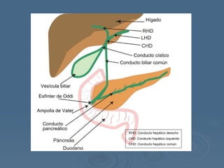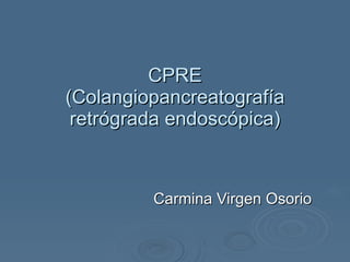 El documento proporciona información sobre la CPRE (Colangiopancreatografía retrógrada endoscópica), un procedimiento endoscópico para explorar las vías biliares. Se describe la anatomía de las vías biliares y cómo se realiza la CPRE, que incluye la introducción de un endoscopio en el duodeno, el paso de un catéter y la inyección de contraste para visualizar posibles cálculos, tumores u otras anomalías. También se menciona la papilotomía, un procedimiento quirúrgico que consiste