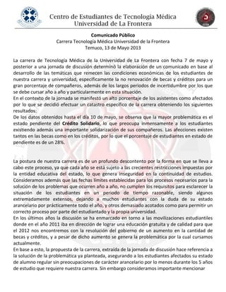 El Centro de Estudiantes de Tecnología Médica de la Universidad de La Frontera emitió un comunicado expresando su profundo descontento por la no renovación de becas y créditos para un alto porcentaje de estudiantes. Un censo realizado mostró que el 28% de los estudiantes de la carrera se encuentran en estado pendiente de su crédito solidario. La carrera propone asegurar a los estudiantes afectados su condición de alumno regular sin preocupaciones de pago por al menos los 5 años que dura la carr