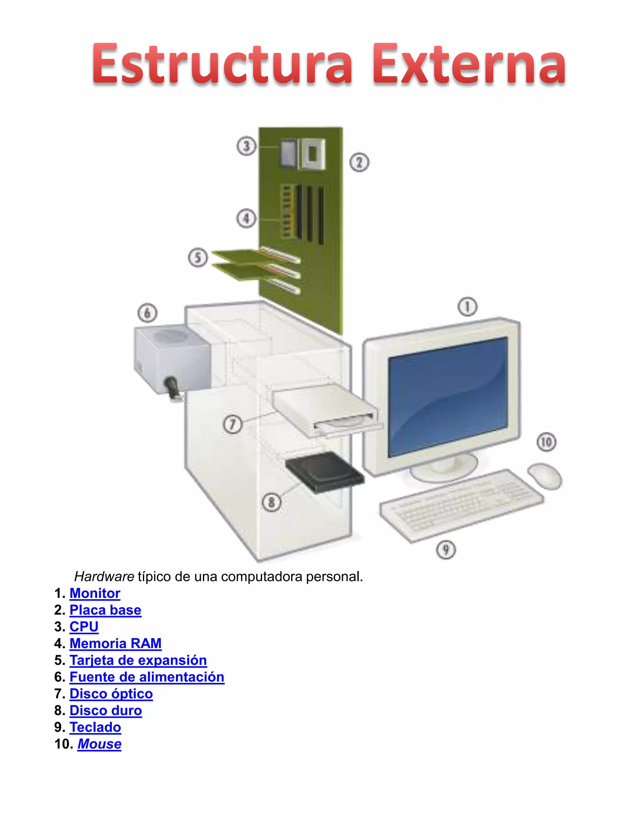 El documento lista las principales partes externas e internas de una computadora personal como el monitor, placa base, CPU, memoria RAM, tarjetas de expansión, fuente de alimentación, discos ópticos y duros, teclado y mouse. También menciona dispositivos adicionales comunes como PEN DRIVE, PROYECTOR, AUDIFONOS, ROUTER, MOUSE, CELULAR, WEBCAM, DVD, PARLANTES Y DISCO PORTATIL.