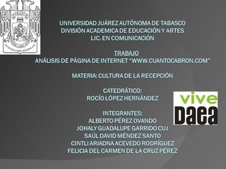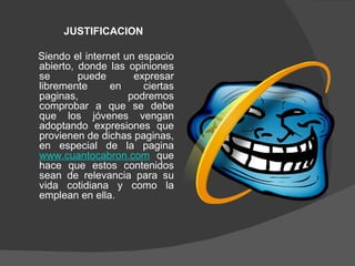 Este documento propone investigar la influencia de la página web www.cuantocabron.com en las expresiones y comportamientos de los jóvenes. El objetivo es identificar el contenido de la página que los jóvenes tienden a adoptar, y determinar cómo esto los afecta. Se hipotetiza que los jóvenes se sienten cómodos usando las frases de la página y que esta los influencia. El estudio usará encuestas y grupos focales para explorar la familiaridad de los jóvenes con la página y su
