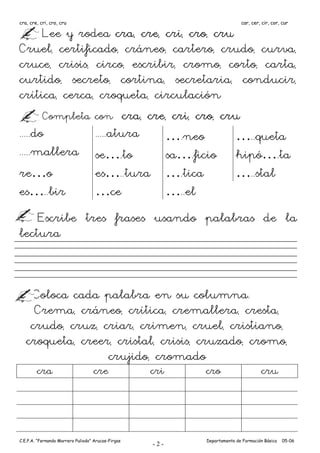 El documento presenta una lista de palabras que comienzan con las letras cra, cre, cri, cro y cru. A continuación, se pide al lector que complete ejercicios utilizando dichas palabras, como rodearlas, completar frases o colocarlas en columnas según su inicio. Finalmente, se incluyen textos cortos para leer y responder preguntas sobre los mismos.