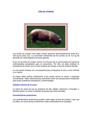 El documento habla sobre el crianza de cerdos. Los cerdos se pueden criar hasta pesar entre 50 y 100 kg y su conversión alimentaria es de 3.5 kg de alimento por cada kg ganado. La cría empieza con una pequeña piara de 2 a 5 cerdas y un macho y requiere buen manejo para evitar enfermedades. La carne de cerdo es nutritiva pero se debe cocinar bien para prevenir enfermedades.