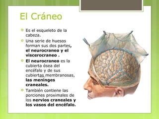 El documento describe la anatomía regional del cráneo, dividiéndolo en neurocráneo y viscerocráneo, explicando los huesos que lo componen, su osificación y articulaciones. Se detalla la estructura de los huesos, incluyendo el frontal, temporal, maxilares y mandíbula, así como sus funciones y ubicaciones. También se abordan las características de la visión facial y posterior del cráneo, junto con la base craneal y sus componentes.