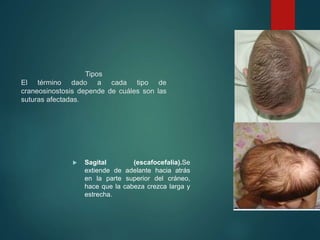 La craneosinostosis es un trastorno caracterizado por el cierre prematuro de las suturas craneales, afectando el crecimiento normal del cráneo y presentándose en uno de cada 2,000 recién nacidos, con mayor prevalencia en niños. Existen varios tipos, como la escafocefalia, plagiocefalia y trigonocefalia, y su diagnóstico implica la evaluación por especialistas, con tratamiento principalmente quirúrgico. Las complicaciones pueden incluir deformidades permanentes, aumento de la presión intracraneal y retrasos en el desarrollo.