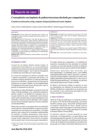 Este documento presenta un caso clínico de craneoplastía utilizando un implante de poliéter-éter-cetona (PEEK) diseñado por computadora para un paciente que sufrió un grave trauma craneoencefálico. El paciente fue sometido a una craniectomía descompresiva de emergencia y posteriormente se le realizó una craneoplastía con un implante de PEEK diseñado específicamente para su defecto craneal mediante tomografía computarizada. El implante de PEEK ofreció una adecuada adaptación