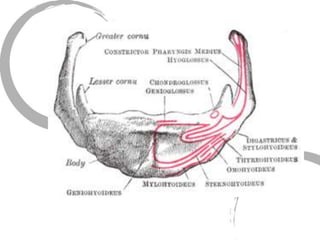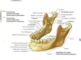 Este documento proporciona información sobre los huesos del cráneo. Explica que el cráneo está compuesto de 22 huesos que se dividen en la parte neurocráneo, que cubre el encéfalo, y la parte viscerocráneo, que rodea la boca y nariz. Describe cada uno de los principales huesos del cráneo, incluyendo el frontal, cigomático, parietal, maxilar, vómer, etmoides, temporal, occipital y esfenoides. También explica articulaciones como la temporomandibular