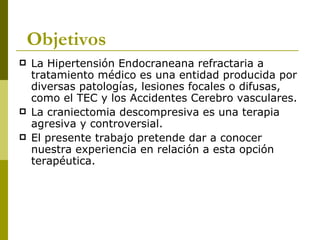 La craniectomía descompresiva se estudió como tratamiento para la hipertensión endocraneana refractaria en 44 pacientes con traumatismo craneoencefálico grave o accidente cerebrovascular. La mayoría de los pacientes con TCE tenían lesiones tipo VI o V según la clasificación de TCDB, mientras que la mayoría con ACV tenían hematomas intraparenquimatosos. La mortalidad fue del 7% y estuvo relacionada con neumonía, sepsis o distrés respiratorio. Los resultados funcionales fueron mejores en aquel