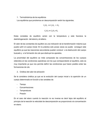 El documento describe el proceso de cracking térmico de hidrocarburos. Este proceso involucra la descomposición térmica de moléculas grandes de hidrocarburos en moléculas más pequeñas a altas temperaturas. Se explican conceptos como el equilibrio termodinámico, la cinética de reacción, los productos obtenidos y el mecanismo de reacción en cadena que involucra la formación y propagación de radicales libres. También se describen variables como la temperatura, tiempo de residencia y tipo de carga, así como