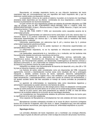 El documento describe el complejo respiratorio bovino, una infección del tracto respiratorio inferior en ganado causada por factores multifactoriales. La infección ocurre cuando virus respiratorios y estrés debilitan las barreras mucociliar y de macrófagos alveolares, permitiendo la invasión y neumonía bacteriana. Las bacterias más comúnmente aisladas son Pasteurella y Histophilus. Factores de estrés como transporte prolongado, cambios en la dieta y climáticos predisponen a los animales a la infección.