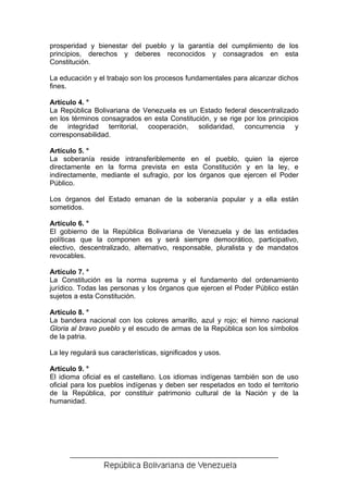 Este documento es la Constitución de la República Bolivariana de Venezuela. Establece los principios fundamentales del país como un estado democrático y social de derecho, con la soberanía residiendo en el pueblo. También define la división política del territorio venezolano y establece los derechos humanos y deberes de los ciudadanos.